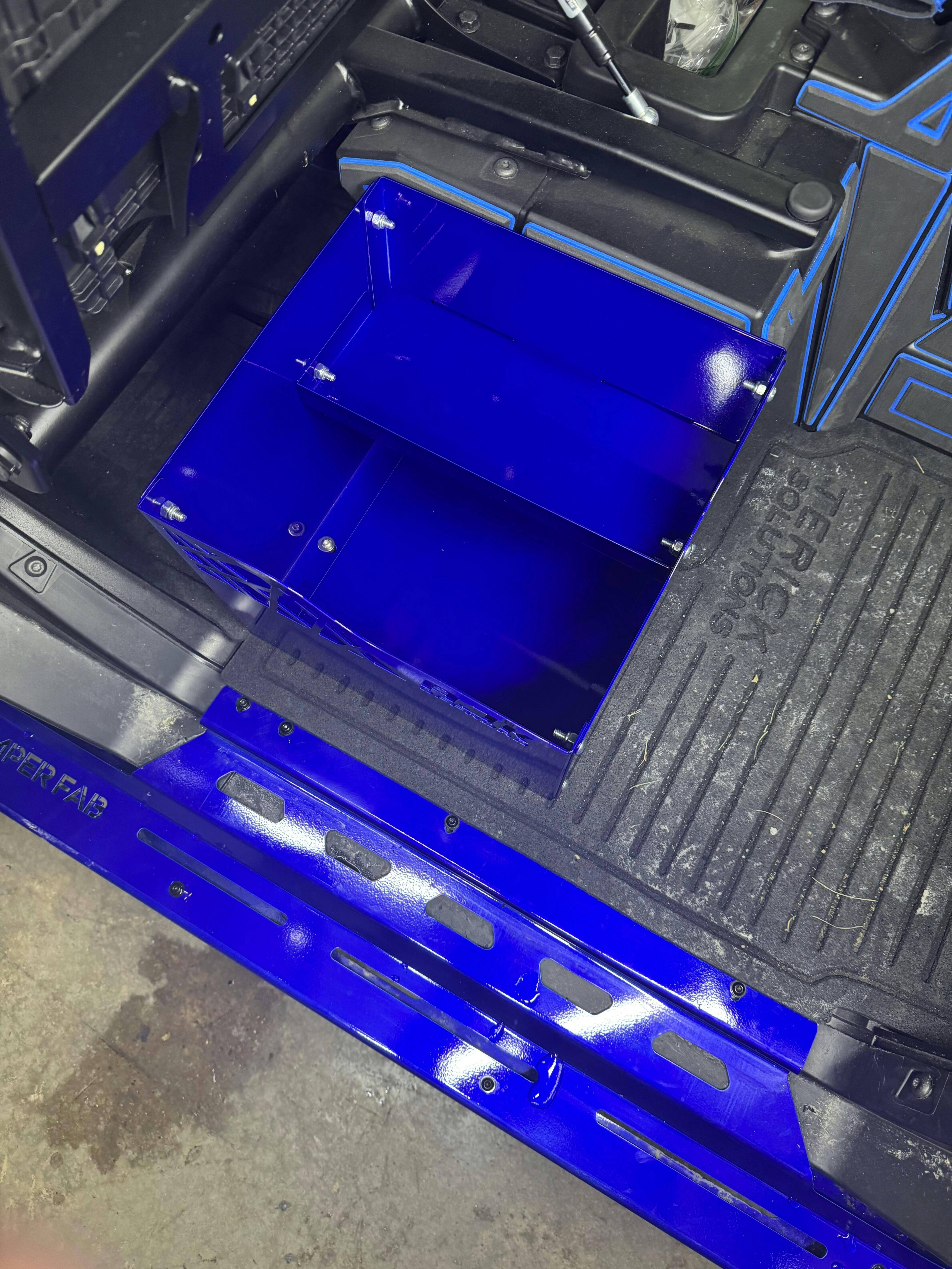 Our Polaris Ranger 1500XD Under Seat Storage Box is CNC laser cut from .062 thick Aluminum and CNC bent and then powder coated our mild textured black powder coat. This box is very easy to install by removing 3 bolts in the floor board and reinstalling them through the box and back in the floor board.