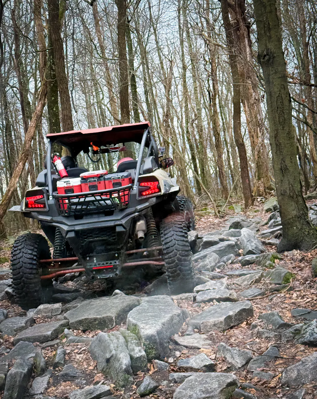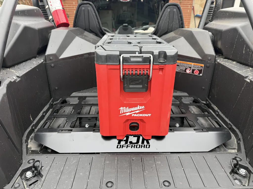 Our Kawasaki KRX Milwaukee Packout Mount is the perfect storage solution for your machine. This mount uses existing factory mounting holes, so no drilling is required. Simply remove four bolts, reuse two of them, and replace the other two with the supplied hardware. Installation is quick and easy. Each mount is CNC laser-cut in-house from 10-gauge P.O. steel and finished with a durable black powder coat.