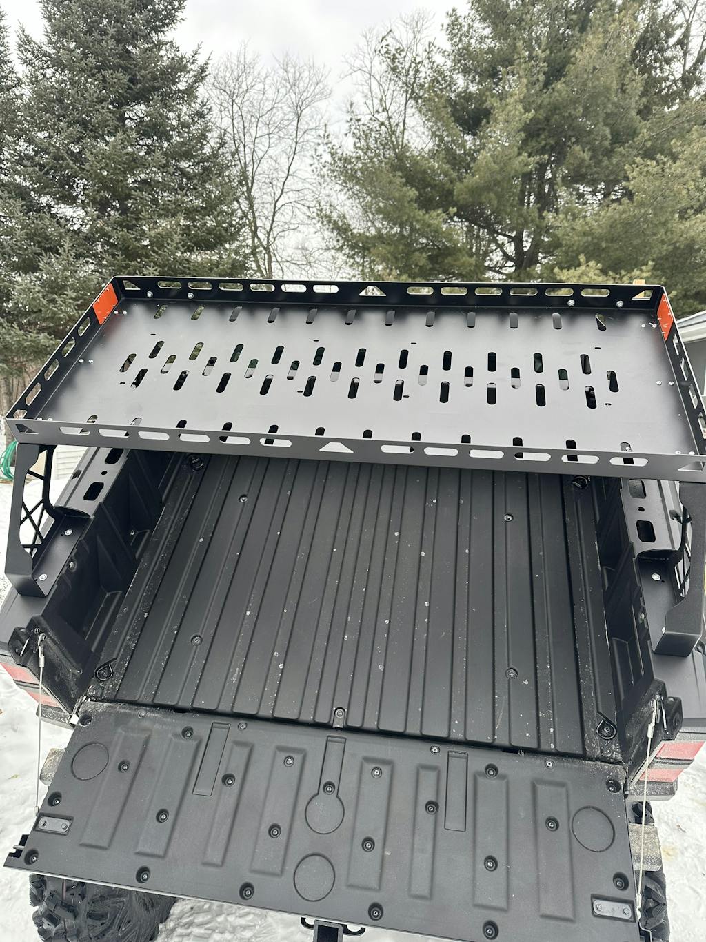 Crafted from CNC laser-cut .125” aluminum, this five-piece, powder-coated black design is built for strength and durability. The top tray measures approximately 22.5” x 54.5”, accommodating multiple gear setups, while the frame features moly panel holes and Rotopax mount compatibility for additional storage flexibility. In our five piece design we supply the legs, tray, and corner bracing, along with all necessary hardware.